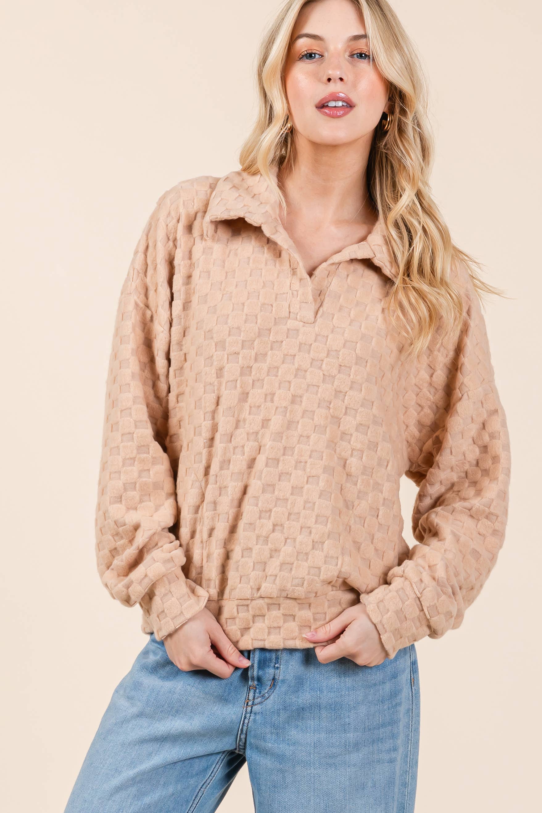 Elevate your everyday look with this check-textured pullover. Featuring a soft feel, relaxed fit, and collared neckline with a subtle split front, it blends comfort and style effortlessly.